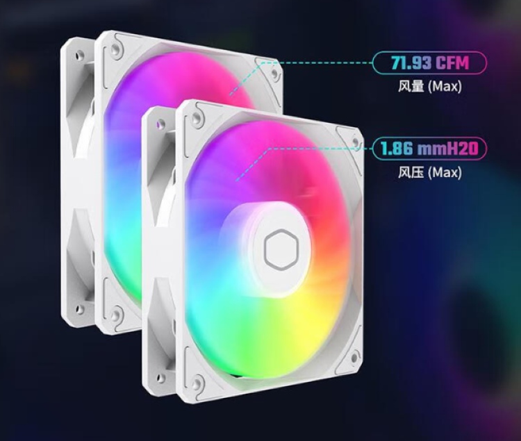 配备两把 120mm ARGB 幻彩风扇,风量 71.93 CFM,风压 1.86mm H2O,通过 3pin 接口,可自定义以及同步 ARGB LED 灯光效果。
