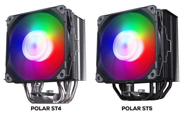Polar ST 系列有 Polar ST4 和 Polar ST5 两款,都采用紧凑单塔方案,区别是ST5是全黑化,为5热管,而且顶部有顶盖;而ST4 是四热管,看着相对简陋些。