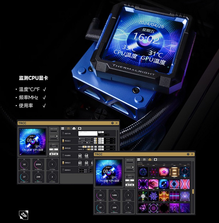 水冷头设计的很不错,机甲风格,而且是磁吸可拆卸模块化设计(也可以旋转角度)。配备2.73英寸 IPS 屏幕,320 x 320 分辨率,450尼特亮度,24bit 真彩显示,可实时显示系统运行情况,界面设计的还不错,还有时间等,并支持自定义,可使用喜欢的图片、GIF动图等,还支持投屏分享和云端更新等。