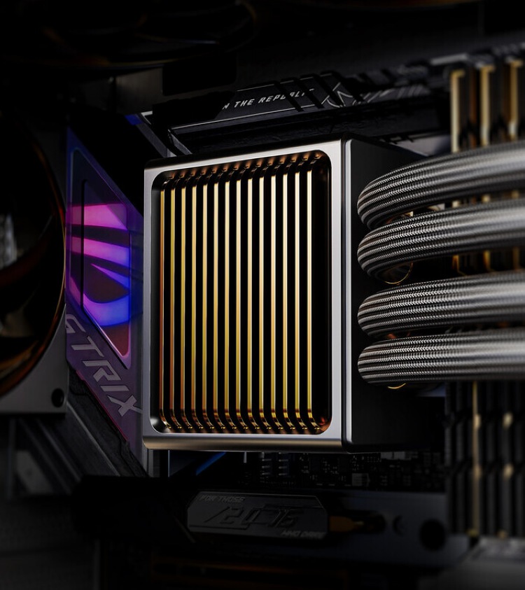 定位最高的是 HUNTER GDL 系列,目前还处在开发原型阶段,没有看到全部,只公开了水冷头和部分细节。该系列有双360mm冷排,宣称比单冷排产品温度可下降 5°C。另外,水冷头是大面积纯铜格栅设计,浓浓的工业风。