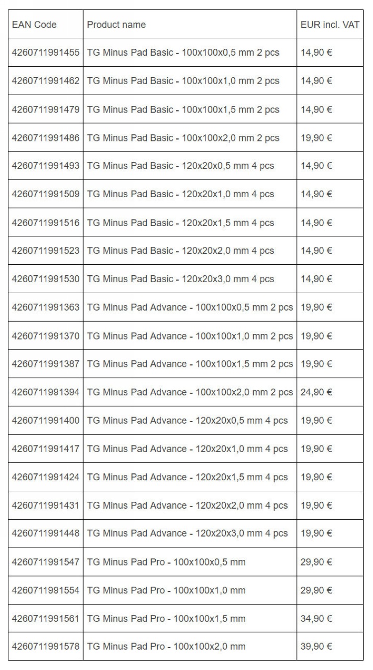 三款在 Minus Pad 8 基础上优化,有更好的导热性、可压缩性和性价比,不导电,适用于 SSD、显卡、GPU 水冷却器以及内存等设备。