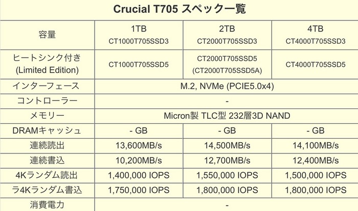 性能方面,美光 T705 的最高连续读取为14500MHz、写入12700MB/s,4K随机读写最高分别为1550K IOPS和1800K IOPS,具体到每个版本的性能如下:
