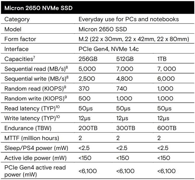 回到美光 2650 系列SSD 上,有2280/2243和2230 三种尺寸规格,搭载上面说的TLC颗粒,提供256GB/512GB和1TB 三种容量,走PCIe Gen 4 x4 通道,兼容NVMe 1.4 协议,支持 SLC缓存加速技术,最高顺序读取为 7000 MB/s,写入6000MB/s,4k 随机最高读写均为1000K IOPS。