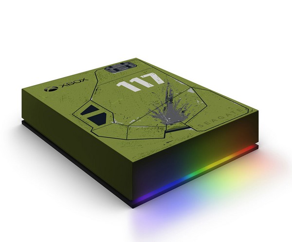 最后,Xbox Game Drive 还有Halo游戏特别版,喜欢《光环无限》游戏的小伙伴可关注,绿色配色,再加上游戏元素涂装,战斗感很足。同时,前面的灯条是RGB的,可通过Seagate Toolkit自定义背光颜色和模式,比标准版要绚丽的多。
