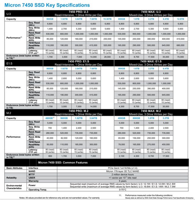 7450系列有Pro和MAX两个版本,定位稍低的7450 PRO 专为纯读取平台打造,可承受 1DWPD 负载;而7450 MAX 适合混合工作环境平台,能承受 3DWPD 负载;