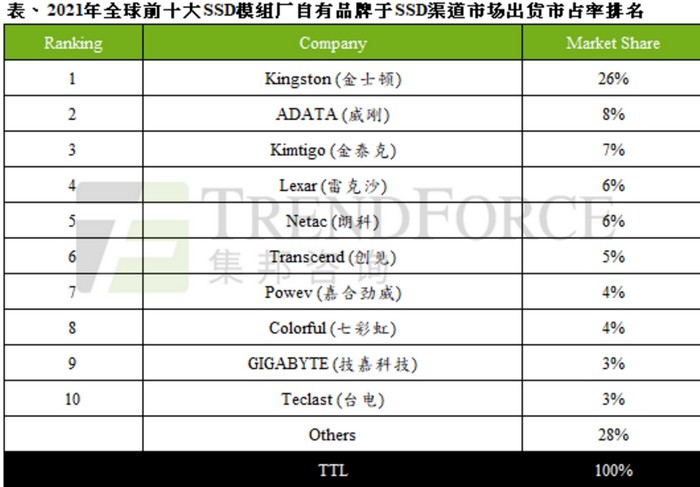 具体来看模组厂商的排名,出货量市占前三名仍为金士顿、威刚、金泰克,前三名仅金士顿市占略有下降,由于生产需求庞大,在晶圆吃紧之际难以满足其订单交期,故出货量有受影响。