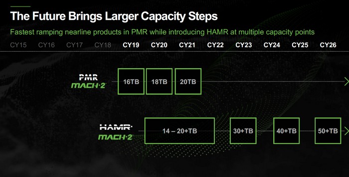 再往后,希捷预计在2025前夕将把容量提升至40TB+,到了2026年,容量又会提升至50TB+。