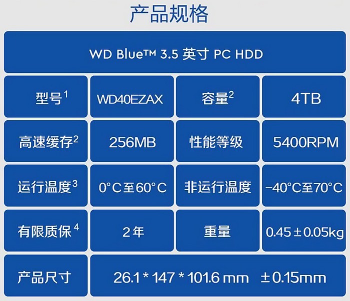 具体型号是 WD40EZAX ,3.5英寸大小,碟片数量未知,搭载 256MB 缓存,转速5400RPM ,采用 NoTouch 斜坡加载技术,将记录磁头置于远离磁盘表面的安全位置,从而保护您的数据。