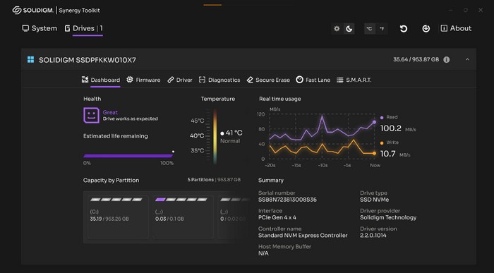 最新版由两部分组成,一部分是驱动(Solidigm Synergy Driver),另一部分是健康检测(Solidigm Synergy Toolkit),其中前者具有一个叫“快速通道”的功能,利用AI技术,通过学习优先处理经常访问的文件,即使是擦写寿命并不多,或储存空间不多的情况下,仍能保证读写性能。以P41 Plus 为例,即使只有 50% 可用空间,4K随机读取仍能提高多达 120%。