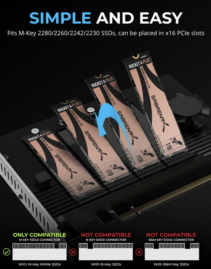 总线PCIe 4.0 x16,内可以扩展四个NVMe SSD,兼容2230/2242/2260/2280等各种尺寸规格M.2 SSD(M-Key)。为了保证性能,最好还是上PCIe 4.0 M.2 SSD,虽然也向下兼容PCIe 3.0/2.0 SSD。