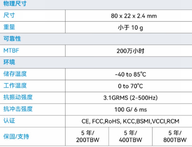 写入耐用性上,512GB、1TB和2TB 分别为200TBW、400TBW和800TBW,全系提供5年质保,200万小时无故障运行寿命。