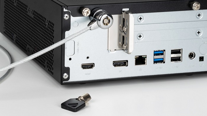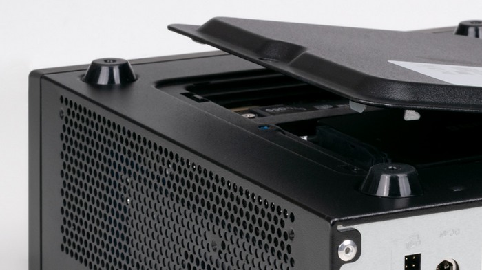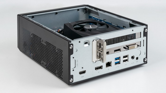 惊喜的是,内可扩展一块双槽显卡,提供一个 PCI Express 4.0 (x16) 和PCI Express 3.0 (x1) ,内能安装一块208mm长显卡,但默认情况下遗憾TDP被限制在75W。不过,你可以额外购买浩鑫外接供电“PRC01”配件,为显卡提供一个8Pin外接供电,这样的话就能上最高225W TDP的显卡了。