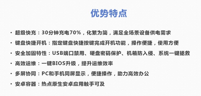 主机的 USB 接口支持 40W 超级快充,可以在 30 分钟内为手机充电 70% 以上。用户还可以双击键盘“P”键直接开机,或根据使用习惯通过 BIOS 自定义设置开机键。