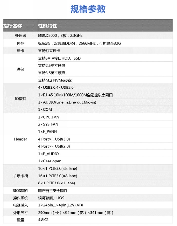 内采用国产飞腾腾锐 D2000 处理器,内包括八个高性能处理器内核FTC663,8MB二级缓存,4MB三级缓存,与服务器CPU腾云S2500相同。兼容64位ARMv8指令集,最高频率可以达到2.6GHz,TDP功耗仅为25W,它集成了非常丰富的I / O接口,并支持飞腾定义的处理器安全架构标准PSPA1.0。另外,该处理器支持支持双通道DDR4 / LPDDR4 内存,内存频率3200MHz。