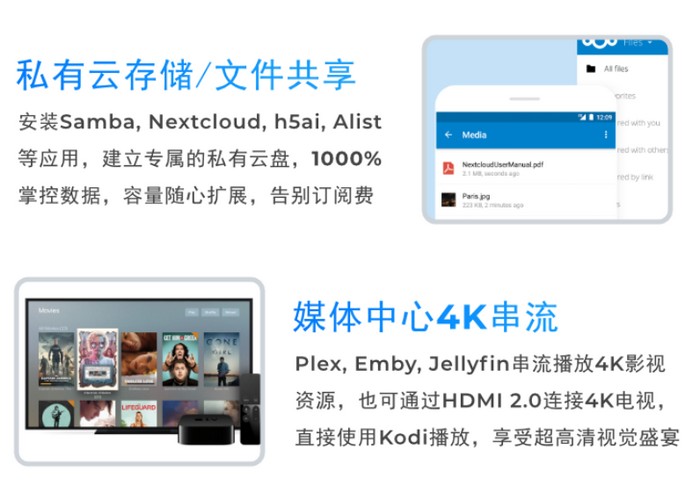 配有英特尔赛扬 N5105或奔腾银牌 N6005 处理器,板载三星/海力士颗粒 8GB 或 16 GB 内存,可扩展一块 PCIe M.2 2242 SSD固态硬盘。