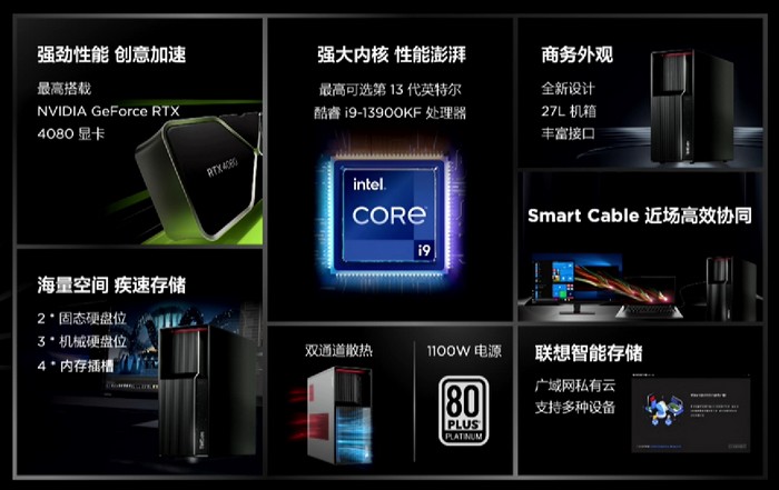 核心配置上,搭载英特尔第13代酷睿i9-13900KF处理器,配备RTX 4080/4070 Ti 独显,有双固态硬盘舱位,3个机械硬盘仓位,以及四条DDR5内存槽,集成1100W白金电源。