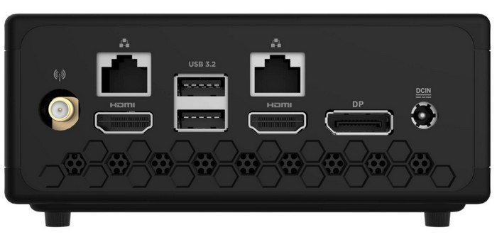 内集成WiFi和蓝牙模块,前面包括:读卡器、耳机和麦克风插孔,以及一个USB 3.2 TYPE-A和一个USB-C接口;背面有两个HDMI输出和一个DisplayPort,两个USB-A和双千兆LAN。