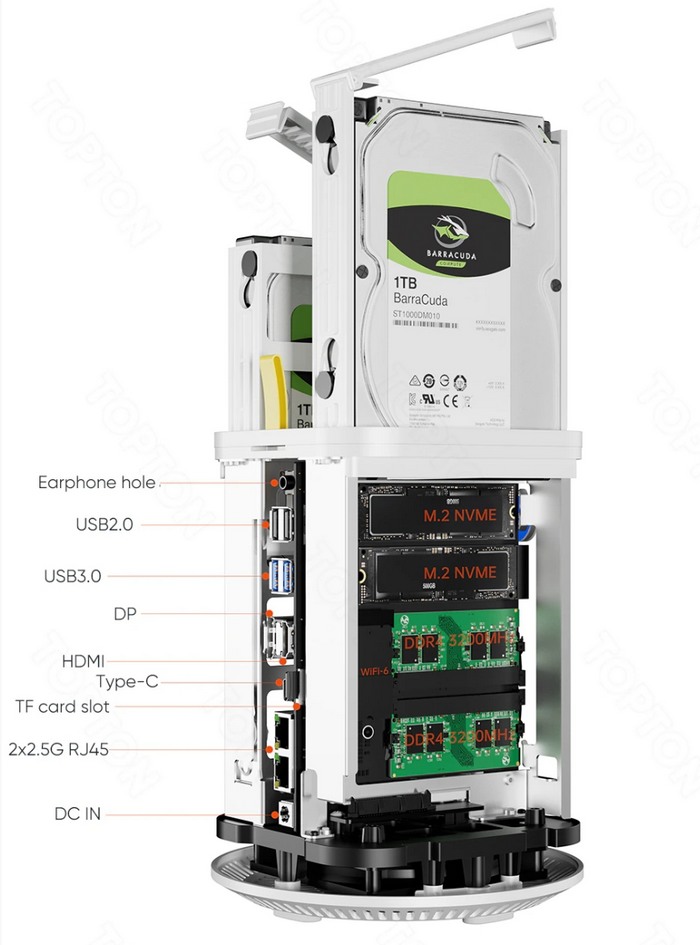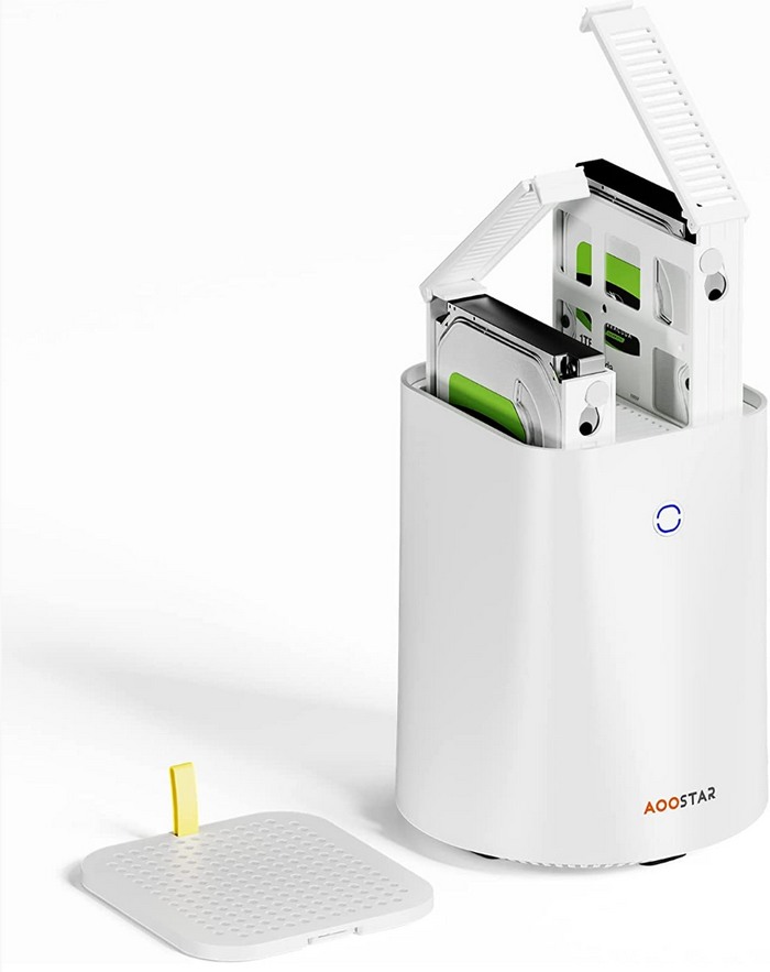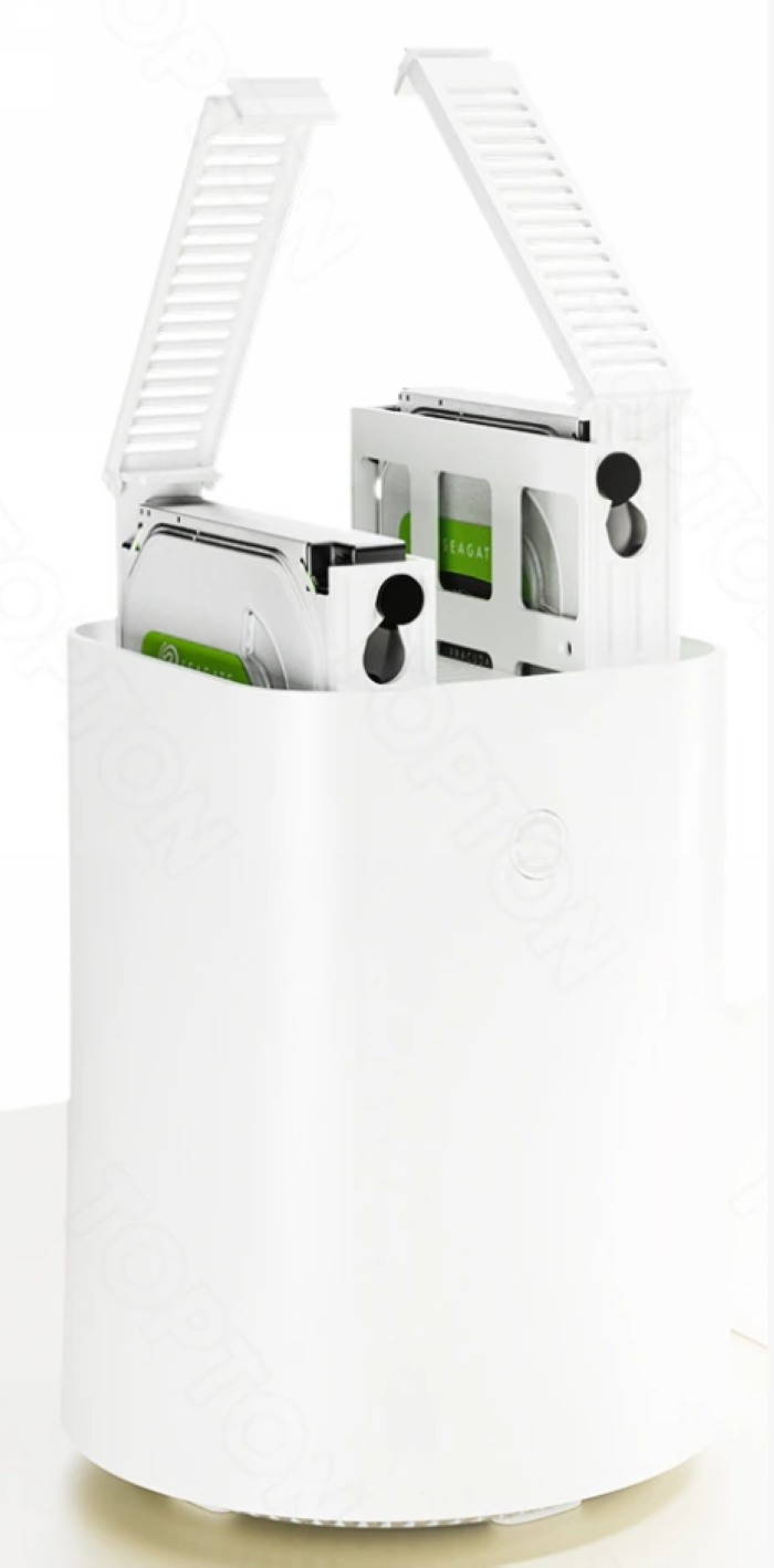 洁白配色,猛一看以为是加湿器或智能音箱。造型独特,内结构更独特,有点像当年的苹果Mac Pro“垃圾桶”。尺寸为 162 x 162 x 198 毫米,可以轻松抽出硬盘。