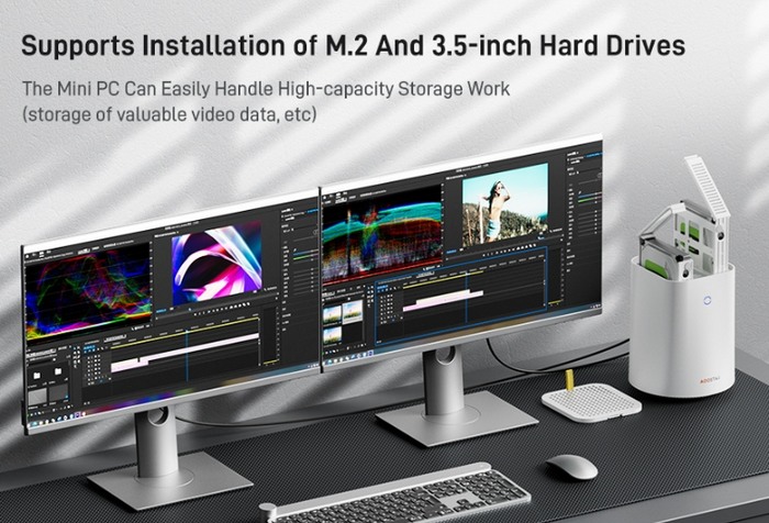 内存和储存方面,支持双通道DDR4-3200MHz内存(最高64GB,可升级拆解SODIMM内存槽),双路PCIe 3.0 NVMe M.2 SSD(2280规格),不够的话,还可以扩展双3.5英寸HDD机械硬盘,这款主机的储存是最大卖点。