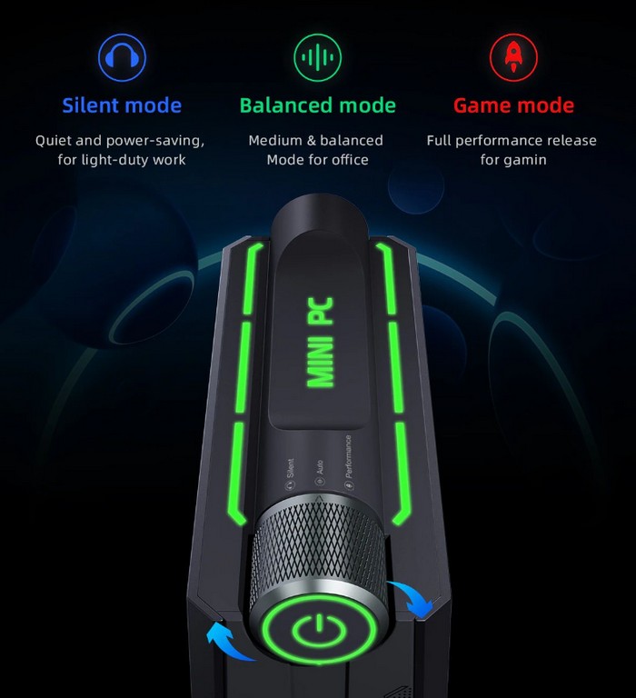 外观就不多说了,在如今迷你主机外形千篇一律大环境下,这个造型和设计确实很吸引眼球,尤其是那个功能比较强大的旋钮,能与BIOS中的功耗墙设置联动,方便用户快速地在静音模式、自动模式和性能模式之间切换。