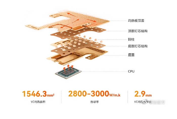 由于性能释放更高,所以散热也强化了,采用了大面积 VC 均热板,散热表面积更大,能够覆盖关键部件,确保关键热源都能得到高效散热。