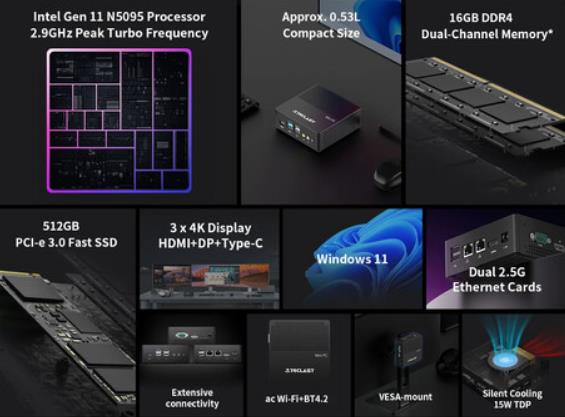内没有采用最新的酷睿N系列处理器,而是上代Jasper Lake架构赛扬 N5095 处理器,4核心、4线程,15W TDP,10nm 工艺,默频2.0GHz/睿频2.9GHz,集成16EU单元核显,支持双通道DDR4/LPDDR4x 2933MHz 内存。