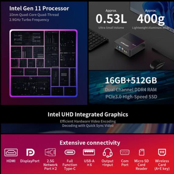 主打扩展,有HDMI、DisplayPort 和 全功能USB Type-C,支持三路4K外接显示。另外,还有六个USB Type-A,两个2.5G千兆LAN,一个MicroSD读卡器,3.5mm耳麦插口和COM串口等。另外,支持 Wi-Fi5 和蓝牙 4.2 ,采用DC外接供电,当然你也可以用USB-C供电。