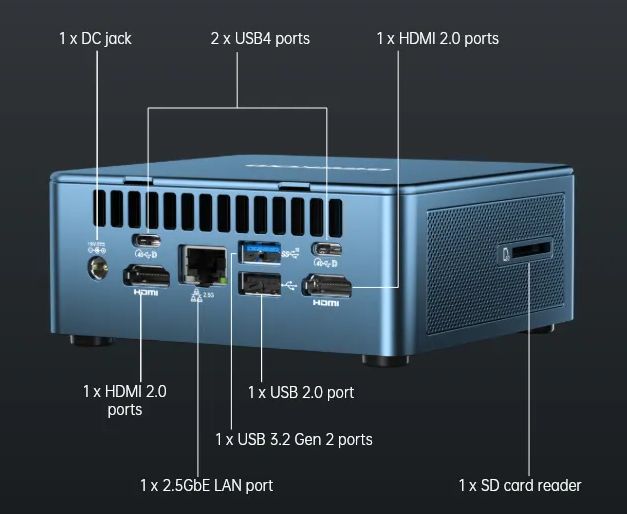 扩展方面,有双USB 4(40 Gbps)、双HDMI 2.0、2.5G千兆LAN、三个USB 3.2 Gen 2 Type-A 、 USB 2.0 Type-A 、3.5mm耳麦插口和 SD 读卡器。该机支持四路4K/60Hz外接显示,其中USB4支持8K / 30Hz。