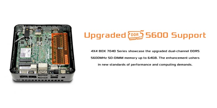 其他配置,提供两条DDR5内存槽(可拆卸升级,最高支持64GB DDR5-5600MHz双通道),有双M.2 扩展槽,其中一个支持2280 M.2 SSD ,另一个可扩展WIFI 无线网卡和蓝牙模块(支持WIFI 6E)。值得一提的是,还提供SATA 3 跳线接口,因此它的内部是可以再额外扩展一块2.5英寸SSD/HDD硬盘。