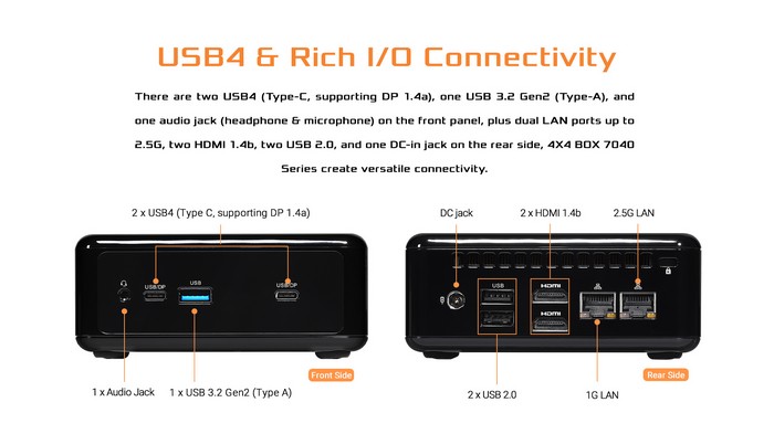 扩展包括:2个USB4,1个USB 3.2 Gen2,2个USB 2.0,双千兆(其中一个是2.5G),双HDMI 1.4、双DP 1.4和3.5mm耳机孔,自带120W电源适配器。