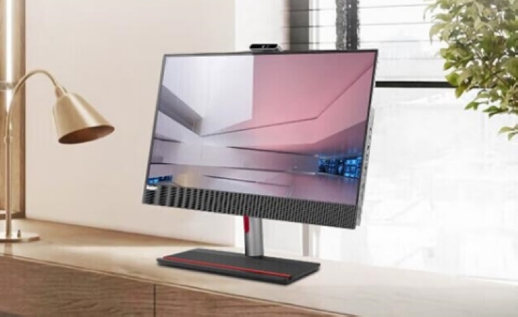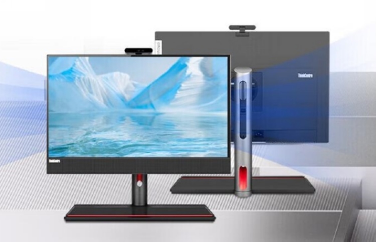 外观沉稳简约,ThinkCentre 经典黑红配色,屏幕三边窄边框,顶部有个醒目的摄像头,500万像素,可以上下20度角度调节,支持智能画面频率,还有安全黑阀防隐私设计。另外,集成4阵列麦克风,支持AI算法,360度拾音,AI智能降噪。自带支架可以多向调节,允许大仰角俯仰、升降、旋转等随意调节。