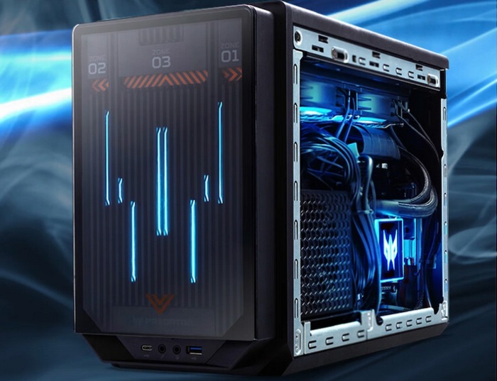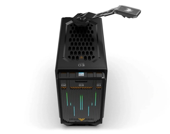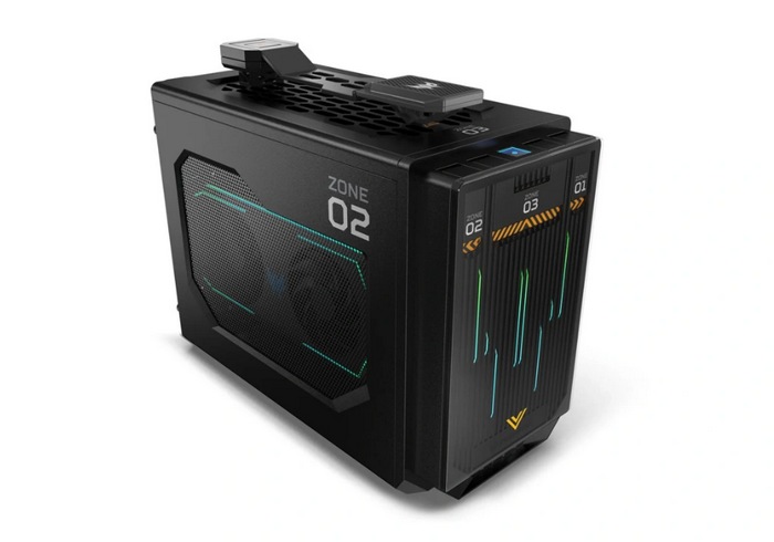 个头不大,宏碁 Predator Orion X“圣盾” 有15.4升体积,重9公斤,亮点是内有三个仓位,使内部能有更大的客制化自由度和及全面性的效能。具体来说,第一个仓位是主舱位,部署主板、CPU、散热器、电源和 SSD ;第二个仓位负责显卡和双 2.5 英寸 SATA HDD 硬盘,第三个仓位可以安装 240 mm 水冷散热器。