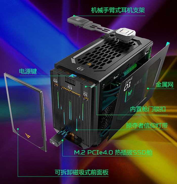 外观上很不错,机箱是矮塔式方案,设计灵感来源于“太空舱”,有大量的背光点缀和透气侧透,顶部还有个类似提手的设计,它其实是耳机挂架。