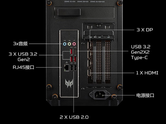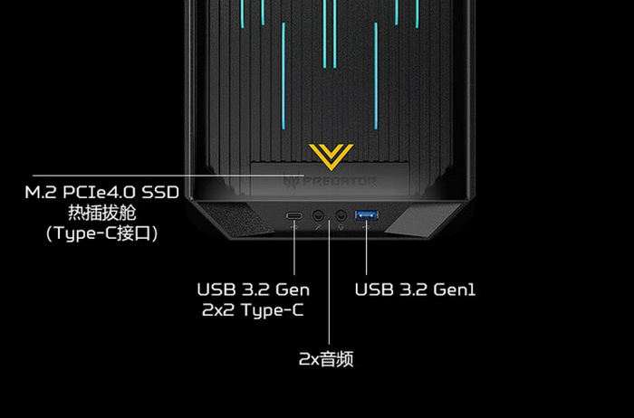 扩展方面,宏碁 Predator Orion X“圣盾” 包括:前置两个 USB3.2 Gen1 (一个 Type-C 与一个 Type-A)、一个麦克风和组合插孔,及后置一个 USB 3.2 Gen2x2 Type-C 接口、三个 USB 3.2 Gen2 Type-A、两个 USB 2.0 和一个 RJ45 接口。