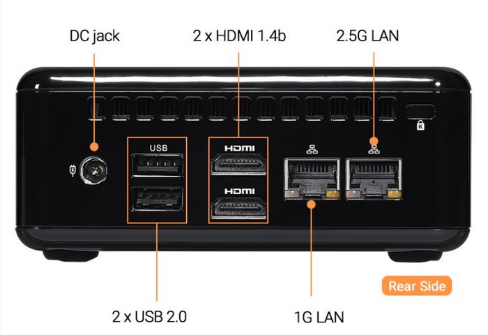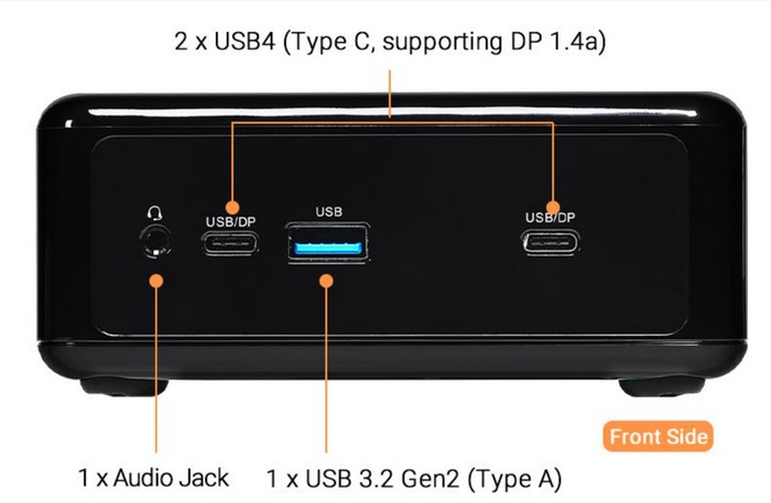 扩展包括:2个USB4,1个USB 3.2 Gen2,2个USB 2.0,2.5G千兆(RTL8125BG)+千兆(RTL8111EPV),双HDMI 1.4、双DP 1.4和3.5mm耳机孔,自带120W电源适配器。