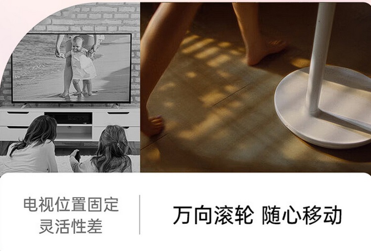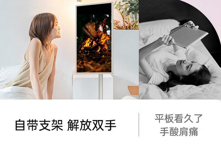 白色机身,四边略宽,自带落地支架可以升降、水平或垂直旋转,自带万向轮还可以推着移动,无线接线也可以用,因为内置了电池,满足不同用户需求。