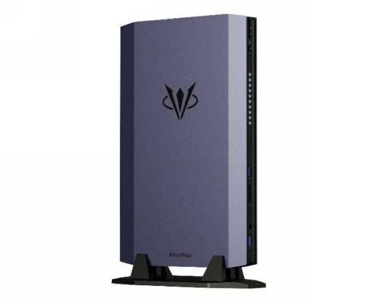 外观比较独特,竖置摆放,机身很薄,官方叫它“立式刀片”设计。机身两侧是金属材质,有“原子侠”LOGO,机身前面有RGB灯效点缀。机身尺寸为:396.5 x 236.4 x 32.5mm,带支架。