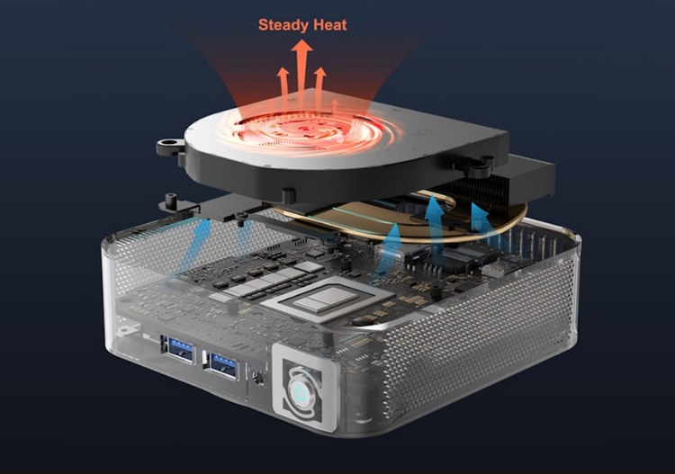 整体简约扁平,一体金属铝材质机身,两侧有大量 CNC 散热孔。内采用主动散热,除一把负责CPU的单涡轮风扇+双热管散热器外,内还有一把小风扇,在底部负责背面的通风散热。