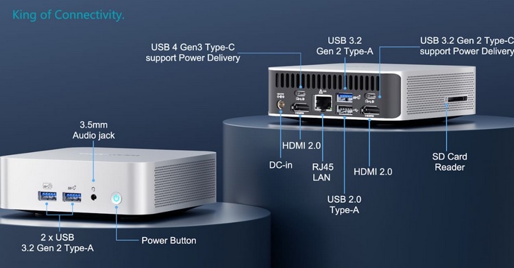 其他方面,支持WIFI 6E 无线和蓝牙5.3,扩展包括:4个USB 3.2 Gen 2 YTPE-A、USB 2.0、双HDMI 2.0、USB 4(100W+DP 1.4)、USB 3.2 TYPE-C、2.5G 千兆LAN、3.5mm耳麦插孔和SD读卡器。