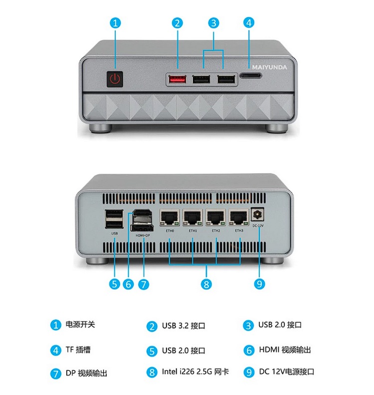 扩展方面,前面提供1个USB 3.2 、双 USB 2.0、TF内存卡槽;尾部有HDMI、DP、爽USB 2.0 和 4个2.5G千兆网孔(英特尔i226-v)。