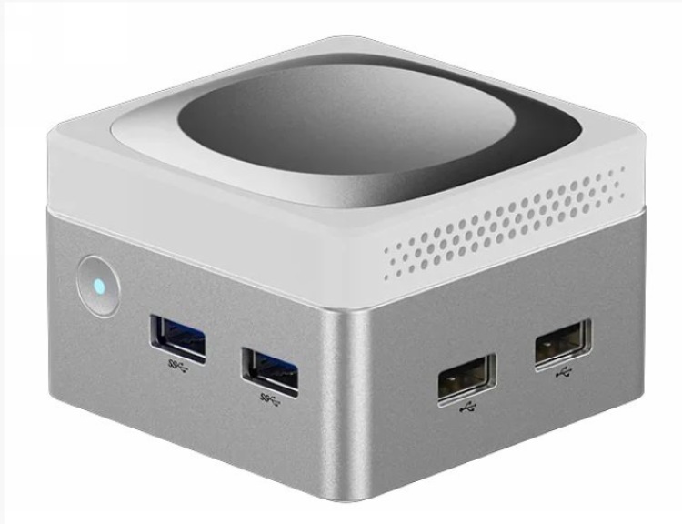 银白配色,顶盖猛一看还以为带喇叭;个头不大很小巧,尺寸只有 73 x 73 x 43mm ,比传统迷你主机要小的多,不占用桌面空间,也方便携带收纳。