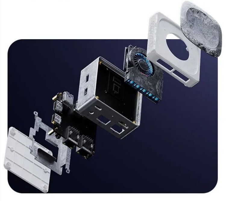 内基于 Alder Lake-N 处理器,搭载英特尔N100处理器(4C/4T,6W TDP),板载12GB LPDDR5-4800MHz 单通道内存,储存则可扩展一个SATA/PCIe M.2 2242 SSD迷你固态硬盘。