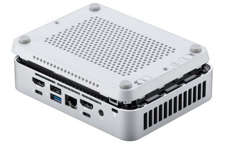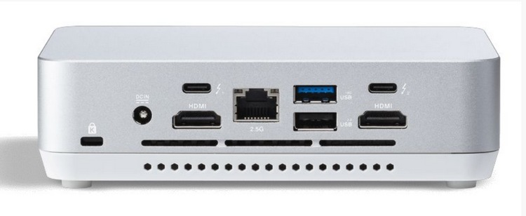 设计简约,银色金属机身,采用一体铝打造,个头和超薄款 NUC 14 Pro 差不多,稍微厚一些为114 x 112 x 41mm,但更重一些为800克。