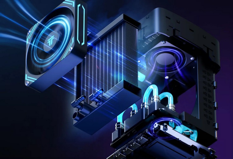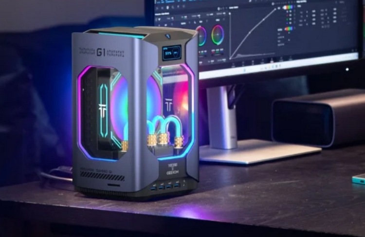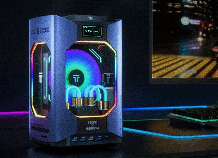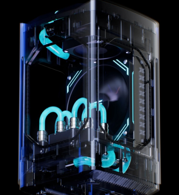 具体来说,只有5.74升,3.7公斤重,机身采用阳极化铝材质打造,机身有大量 RGB 灯效点缀,营造除科幻未来主义。顶部带有屏显,可以显示CPU/GPU的使用情况,以及温度等。