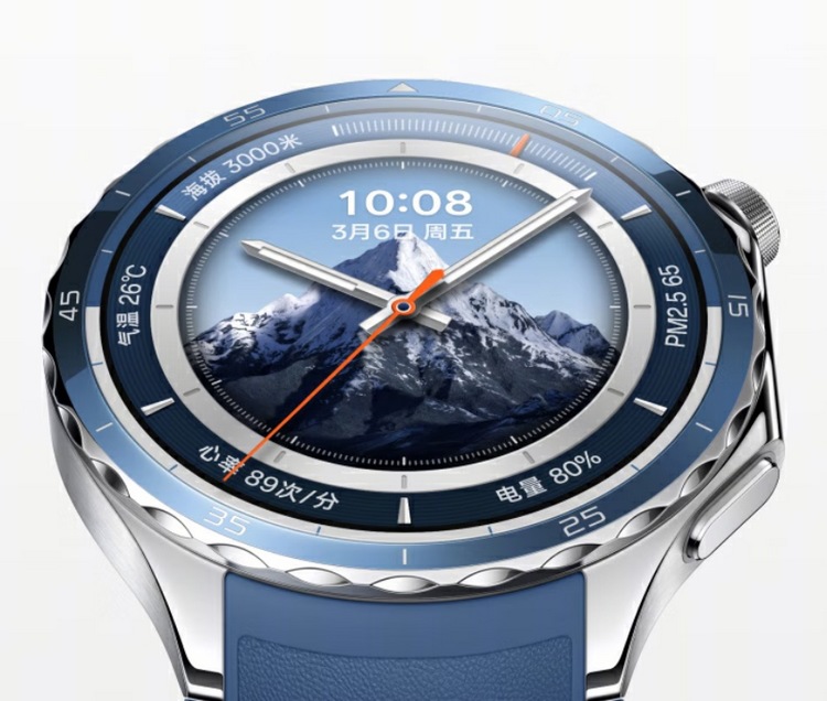 外观和用料升级,采用钛合金双色工艺表圈、蓝宝石水晶表镜(8级+莫氏硬度)、旋转表冠、以及1.5英寸 LTPO 超亮钻石屏,峰值亮度2200尼特,户外也清晰。