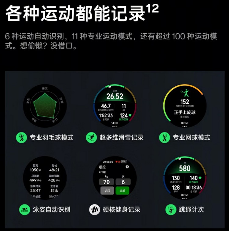 运动健康方面,支持心电图、心率、皮肤温度和血氧监测,支持多达100+种运动模式,包括11种专业模式,其中6种可以自动识别,并支持双频GPS定位,支持离线导航,还有跑姿分析功能。