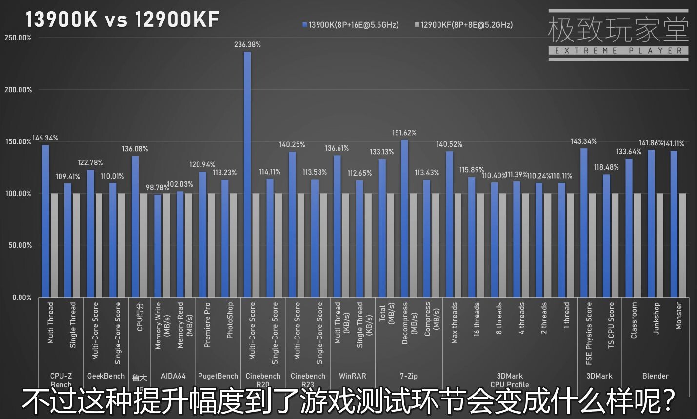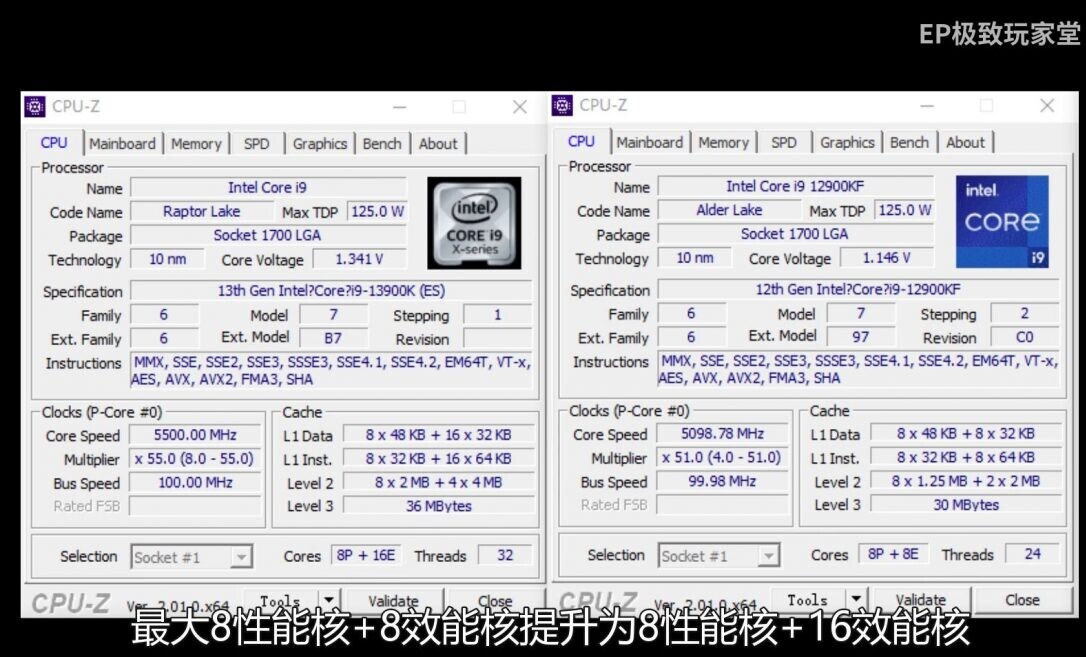数据来自B站Extreme Player极致玩家堂,他拿到的是一颗ES版本的i9-13900K,包括8个P性能核心,16个E能效核心,由于能效核心翻倍,所以这次它拥有24核心/32线程。另外,L2缓存也翻倍。