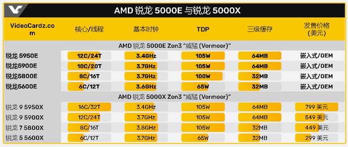 首发有四个版本,最顶级的锐龙5950E为12核/24线程,默频3.4GHz,加速频率未知,64MB L3缓存,105W TDP;