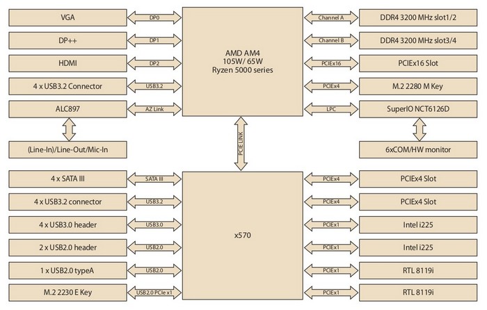 最后来看看这块 AIMB-522 主板。它基于X570芯片组,配备 AM4 插槽,边缘有四条 DDR4 内存插槽,尾部扩展丰富,包括双万兆LAN和双 2.5 GbE,还有多达八个 USB 3.2 Gen2 、四个 USB 3.0 Gen2 和三个 USB 2.0。该板支持研华 DeviceOn 技术,一种基于可以远程访问和管理的技术。