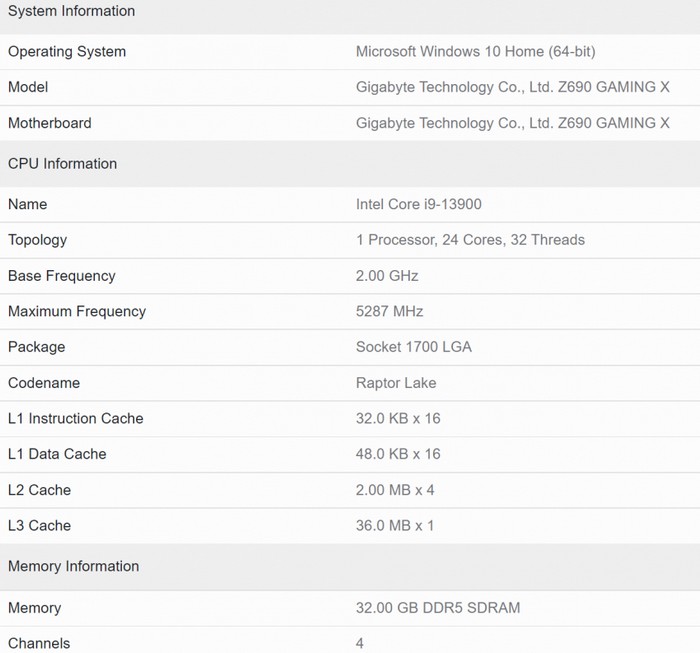 酷睿 i9-13900 据称它的最高睿频为 5.57 GHz,测试平台用了 32GB DDR5 内存和某嘉Z690 Gaming X主板。